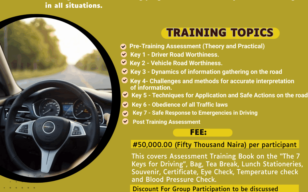 Fee: N50,000,00 (Fifty Thousand Naira) per Participant. This covers Assessment, Training, Book on “The 7 Keys for Driving”, Bag, Tea Break, Lunch, Stationeries, Souvenir, Certificate, Eye check, Temperature check and Blood Pressure check.
